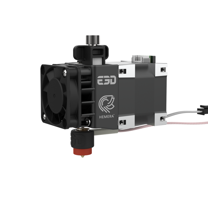 Die 3.32:1 Dual-Drive-Zahnräder von Hemera erzeugen einen Druck von bis zu 120N auf Ihr Filament von beiden Seiten, für eine präzise, kontrollierte Extrusion ohne Drehmomentverluste. Scharfe, individuell bearbeitete Hobb-Zähne gewährleisten eine hervorragende Filamentgriffstärke, und runde Profile helfen, Ablagerungen von Filamentresten zu reduzieren, für eine qualitativ hochwertige, konsistente Extrusion von der ersten bis zur letzten Schicht.