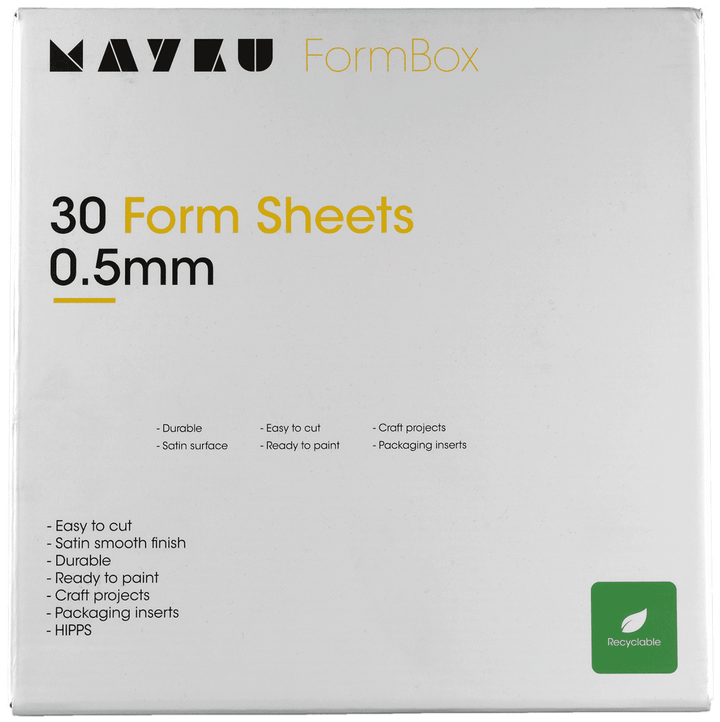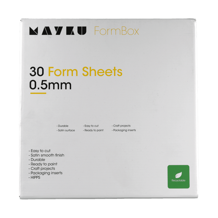 Die Mayku FormBox Form Sheets sind speziell für die Mayku FormBox entwickelt und bieten eine langlebige, satinierte Oberfläche für kreative und funktionale Projekte. Mit einer Stärke von 0,5 mm eignen sich die Platten perfekt für Produktverpackungen, Prototypen und dekorative Bastelarbeiten. Das Material ist teilweise aus recyceltem Kunststoff hergestellt und zu 100 % recycelbar – für nachhaltige Ergebnisse ohne Kompromisse.