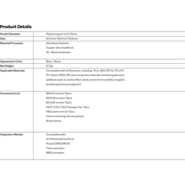 Kompatible Materialien: | Kompatibel mit allen Filamenten, einschließlich: PLA, ABS, PETG, TPU, PP, PC, Nylon, PEEK, PEI und Verbundmaterialien mit abrasiven Zusätzen wie Kohlefaser, Stahl, Holz, Borcarbid, Wolfram und phosphoreszierenden Pigmenten |