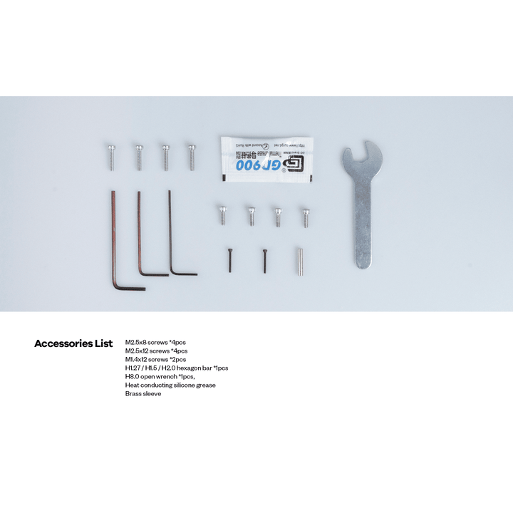 M2.5x8 Schrauben *4 Stück M2.5x12 Schrauben *4 Stück M1.4x12 Schrauben *2 Stück H1.27 / H1.5 / H2.0 Sechskantschlüssel *1 Stück H8.0 offener Schraubenschlüssel *1 Stück Wärmeleitende Silikonpaste Messinghülse |