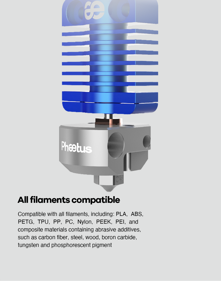 • Geeignete Materialien: Kompatibel mit allen Filamenten, einschließlich PLA, ABS, PETG, TPU, PP, PC, Nylon, PEEK, PEI und Verbundmaterialien mit abrasiven Zusätzen wie Kohlenstofffaser, Stahl, Holz, Borcarbid, Wolfram und phosphoreszierenden Pigmenten.